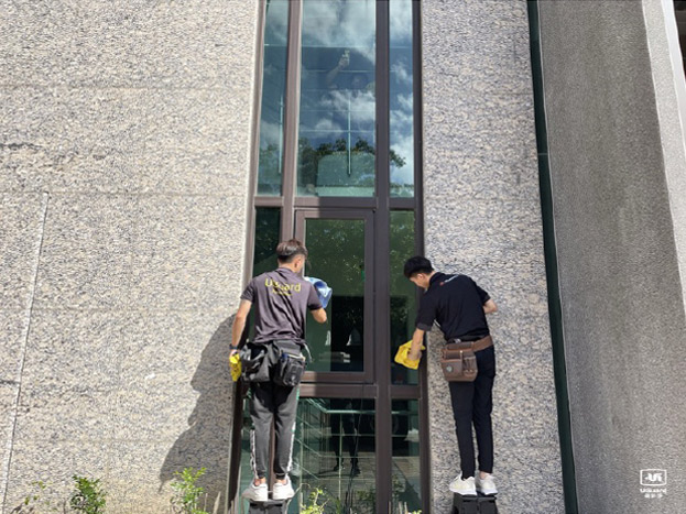 以工作人員之安全為第一要務,派遣吊車前往案場協助,連續3天上工的節奏十分緊湊,如期完工!室內玻璃因經常使用,容易沾附指紋等留下痕跡,室外牆玻璃經風吹日曬雨淋,清潔維護不易,玻璃鍍膜後即可大幅減少清潔時間及清潔劑使用,降低環境污染又可使玻璃常保如新,一舉數得!
